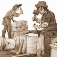 Trois hommes cassent des pierres sur le bord d’un chemin.